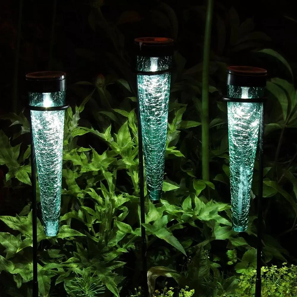 The ever-popular Achla Designs Solar Sparkle Cones have been adapted for garden stakes. Made of colorful hand-blown glass, we use a layered glassmaking technique that gives the glass a crackled effect. As the solar-powered LED light shines shine through the hand-blown, colored glass, a beautiful glow is created, adding a magical ambiance to your yard, garden, or patio. Light up paths and walkways, garden beds, and patio borders- stake into the ground in any area of the yard or landscape. Requires no wires or cords. Great outdoor lighting lets you enjoy spending time outside, even after the sun goes down.