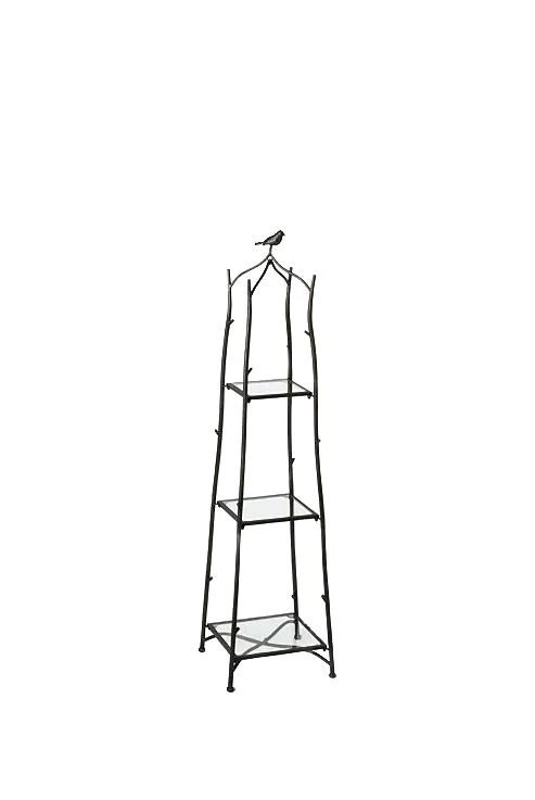 Plants and cherished curios take center stage when displayed on this handsome, nature-inspired plant stand. The sturdy steel frame has a rustic bronze finish and holds three glass shelves. The compact footprint fits easily into any indoor living space, and is ideal for use in a corner. 52″ H; folds flat for easy storage. A customer favorite!