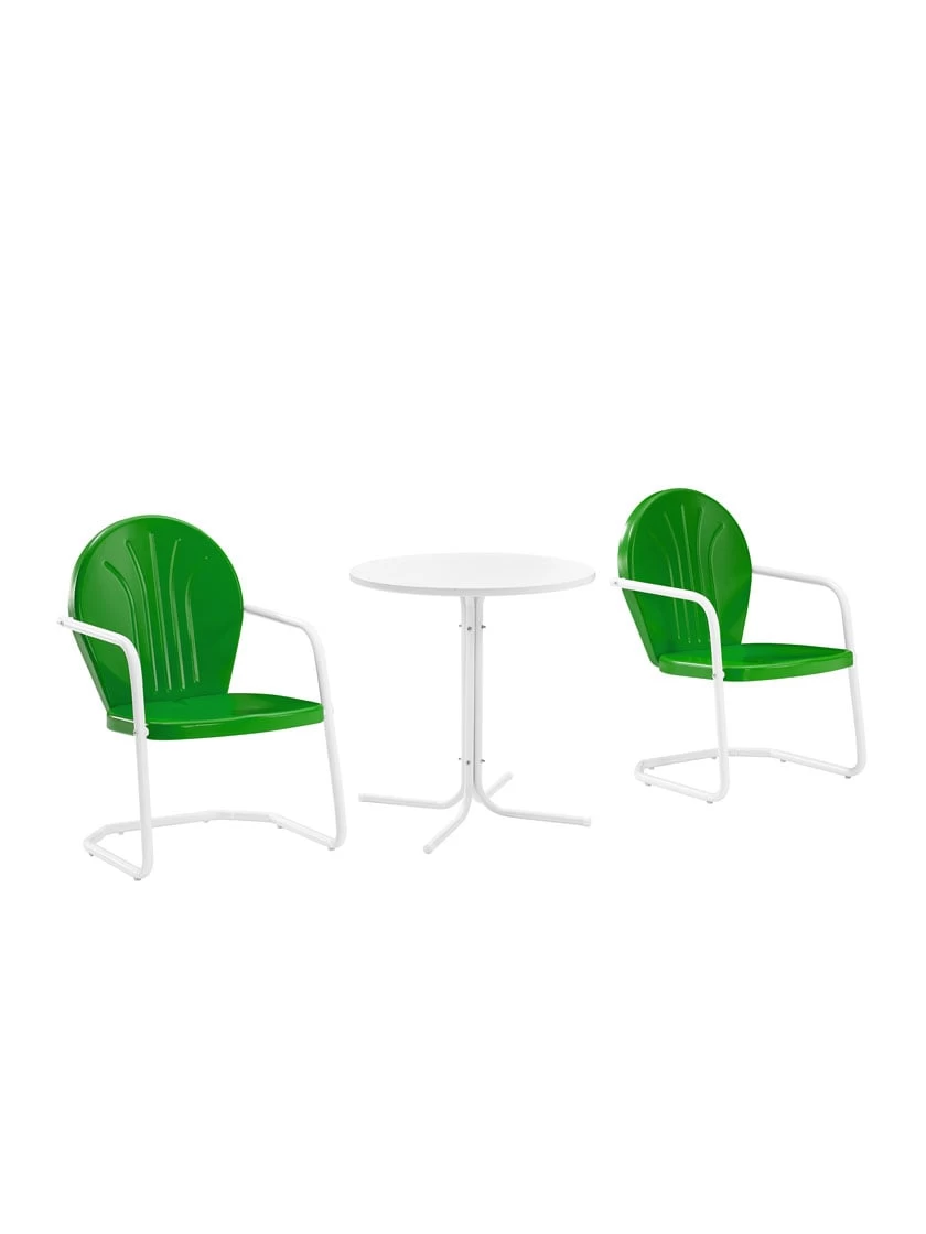 Add retro simplicity and function to your outdoor retreat with the Griffith 3pc Bistro Set. Featuring a powder-coated finish over durable steel, the bistro table partners with two classic Griffith Chairs. Each chair has a vintage style that comes in a variety of vibrant colors and offers a cantilever base with just enough flex for lounging in comfort. The table has a sturdy pedestal base that easily tucks between the chairs, making the Griffith 3pc Bistro Set ideal for a small balcony or patio.