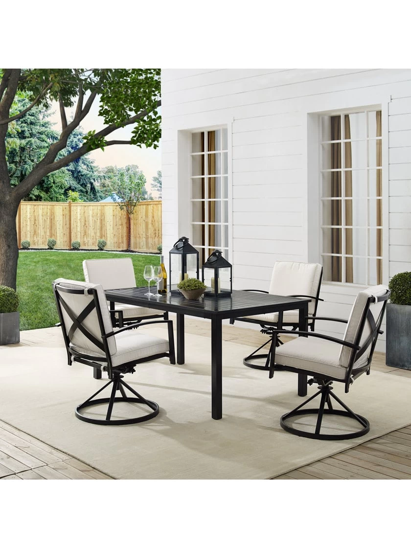Gather around for a fun and fashionable outdoor meal with the Kaplan 5-Piece Outdoor Dining Set. Featuring a rectangle table with a slatted design that elevates the sturdy steel construction, creating a perfect partner to the four outdoor swivel dining chairs. Each chair showcases comfy back and seat cushions plus a classic x-back design and 360-degree swivel. The table’s standard umbrella hole will allow you to add some shade when dining on a hot summer day. Simple and stunning, this dining set will be a welcome addition to your outdoor entertaining.