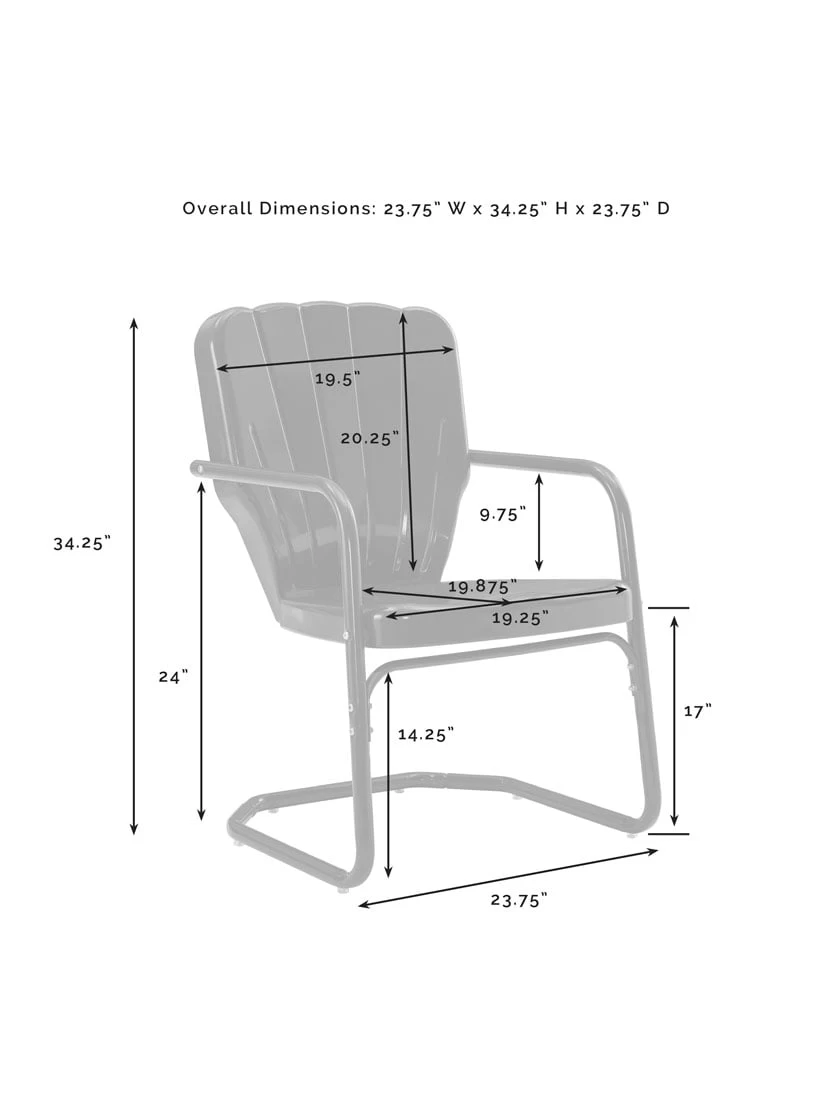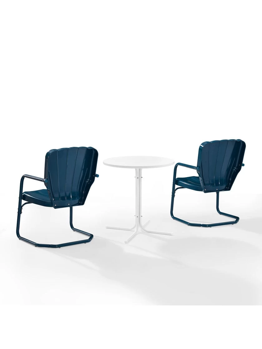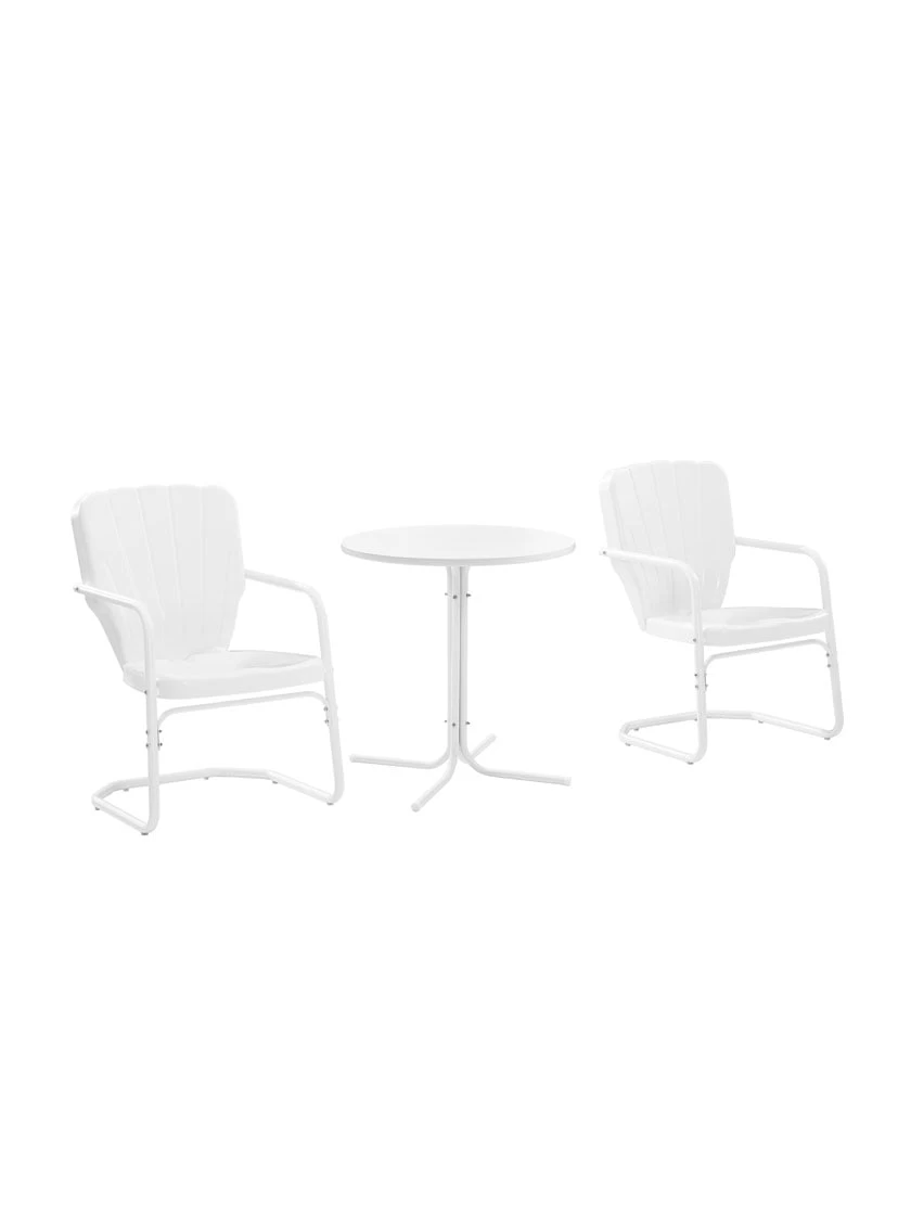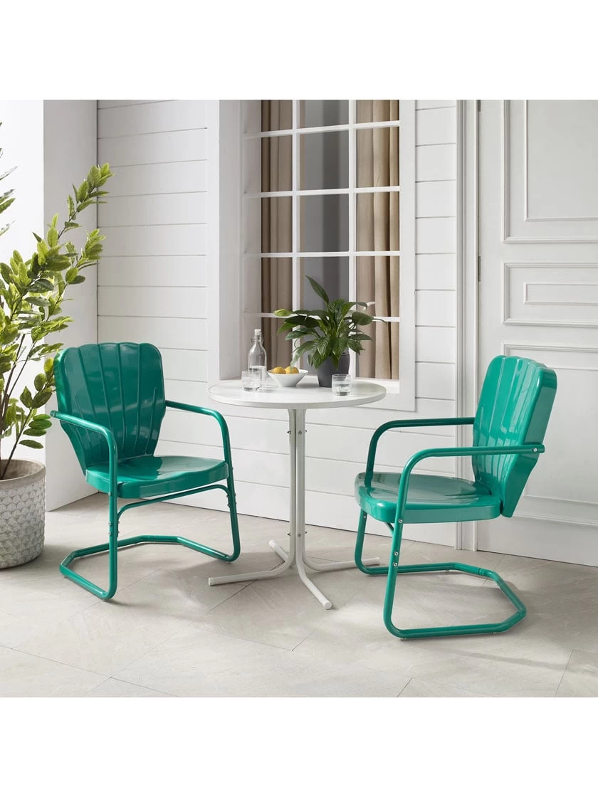 Inspired by the designs of yesteryear, the Ridgeland 3pc Bistro Set brings class and charm to your outdoor space. Two vintage-style chairs in vibrant colors surround a simple metal bistro table for a fun and functional outdoor lounging experience. Each chair features a clamshell back with decorative grooves, plus a cantilever base that provides just enough flex for lounging in comfort. The tableâs sturdy pedestal base is comprised of four metal legs and easily tucks between the chairs, making the Ridgeland 3pc Bistro Set ideal for a small balcony or patio.