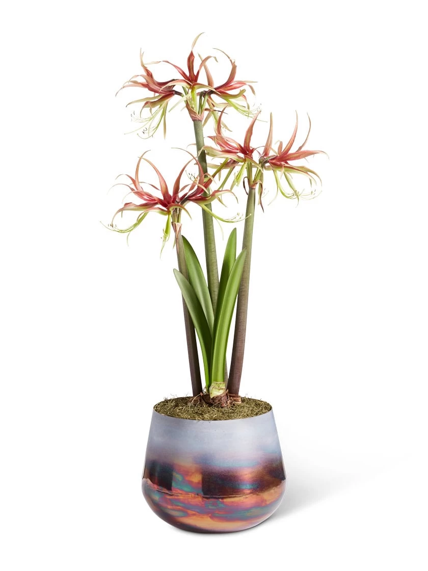Why pick just one dramatic cybister amaryllis when you can have three? These stunning flowers, with their spider-like petals, are a sight to behold. Resembling rare orchids they’re ultra easy to grow and, with just a little care, will rebloom year after year. Reusable powder-coated steel cachepot is flame finished and hand-painted for a fiery, shimmery effect. Full growing instructions included.