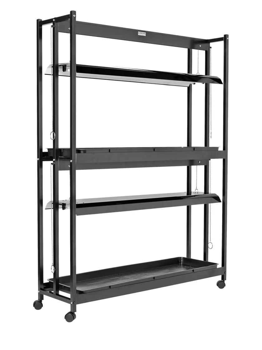 Grow orchids and other light-hungry plants! With these high-intensity lights you can grow plants from seed all the way to flowering and fruiting. Each fixture has three full-spectrum,T5 fluorescent bulbs, so they provide 50% more light than dual-bulb versions. The rugged, powder-coated, rustproof aluminum frame has two growing shelves that provide plenty of room for seedlings and houseplants. The light fixtures easily adjust up and down as plants grow, and there’s plenty of headroom for tall plants. Includes frame, light fixtures, T5 fluorescent bulbs, watertight trays and casters.