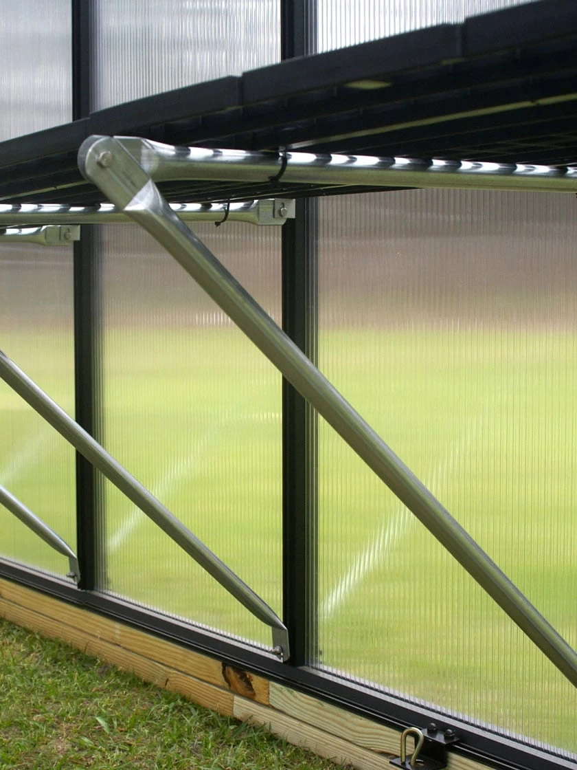 The Monticello 12 foot Work Station Kit is specifically designed for the Monticello line of 12FT greenhouses. The design is simple, unique and thoughtful. The Work Station can be installed either during initial construction or at a later time. The Kit Includes a full 12 ft run (24ā deep) for use on either side of the Monticello greenhouse. Since the installation of the support bars uses the inside bolt tracks the shelving could be set at any height within the greenhouse (up to 4ft off the ground). The sturdy vented shelving units on the Work Station are constructed from commercial grade high impact PVC. The vents allow water and air to circulate as well as allowing sunlight to reach underneath the Work Bench. The angle support design allows for free flowing movement without concern for support legs to trip over when working at the workbench. Just like our greenhouses, the Monticello Work Station Kit is proudly made in the USA from start to finish.