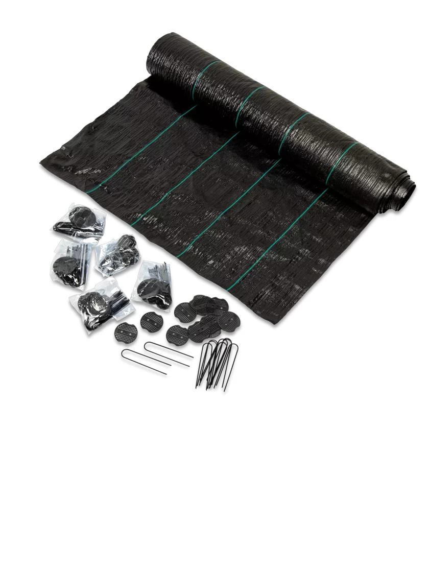 Keep weeds at bay between your garden beds and rows with this super-simple system. Just roll it out and secure in place with the steel stakes. The perforated plastic guides not only help anchor the stakes, but also prevent stress tears in the fabric.