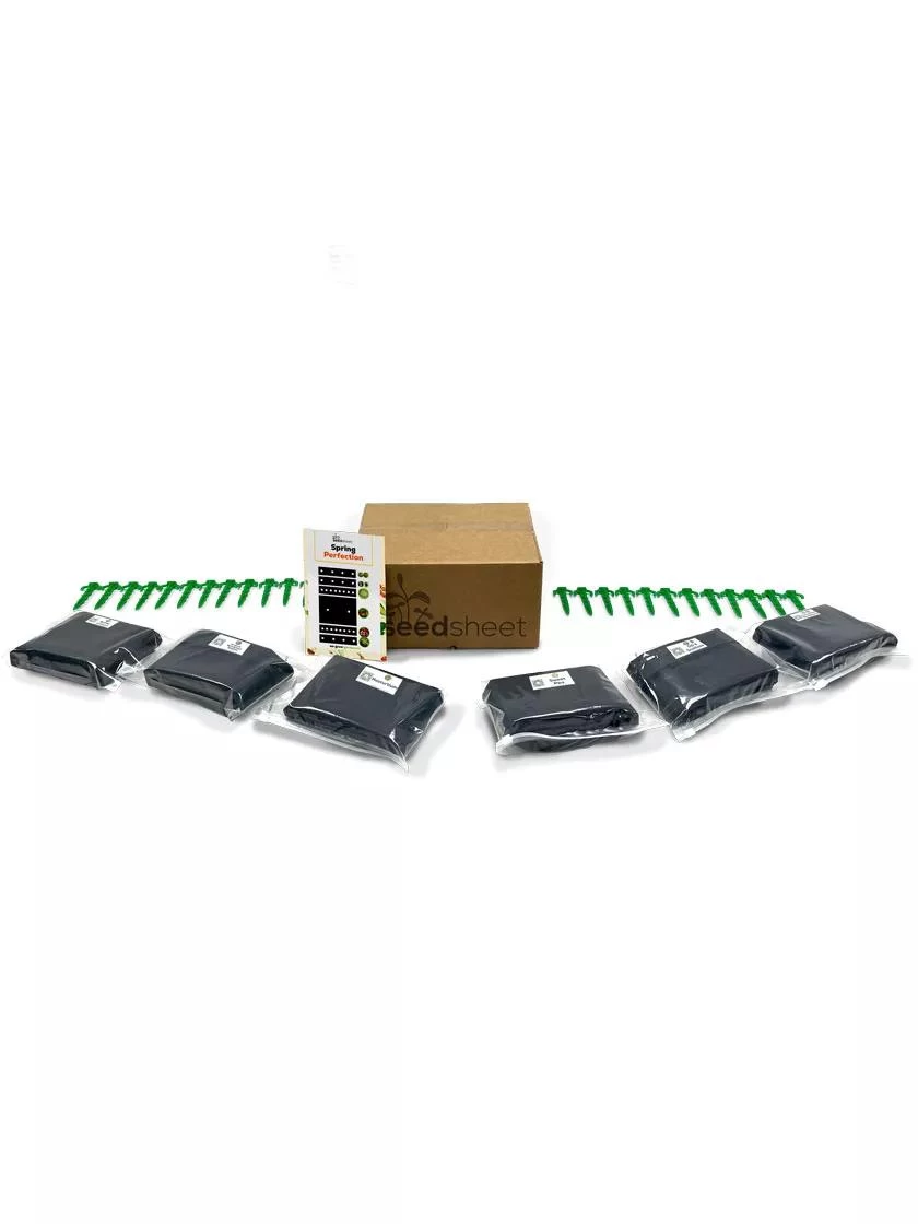 The dissolvable seed pouches are made out of a food-safe polyvinyl alcohol film, most commonly used in gel casings for pills. The permeable weed-blocking fabric keeps weeds at bay without harmful chemicals, and allows for water and air exchange. While sheets arrive in set dimensions, you can easily cut to desired size (just be careful not to cut into seed pouches). Included stakes help to anchor each SeedSheet.