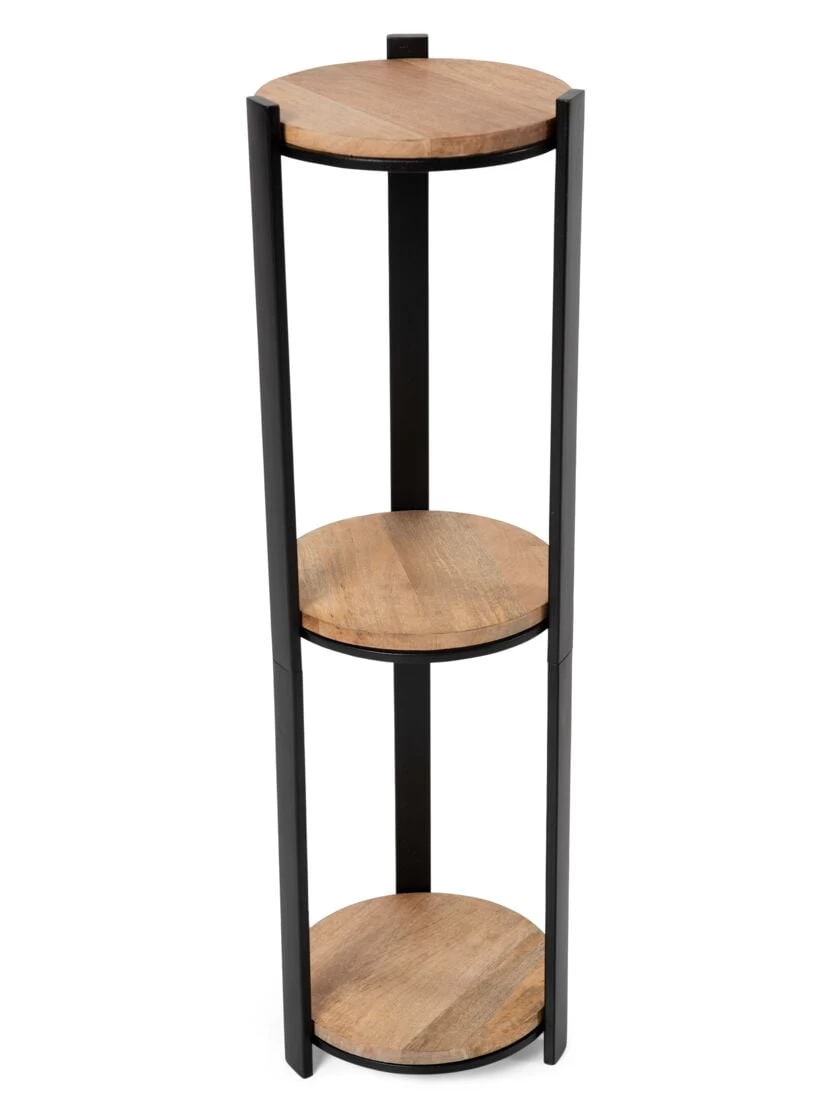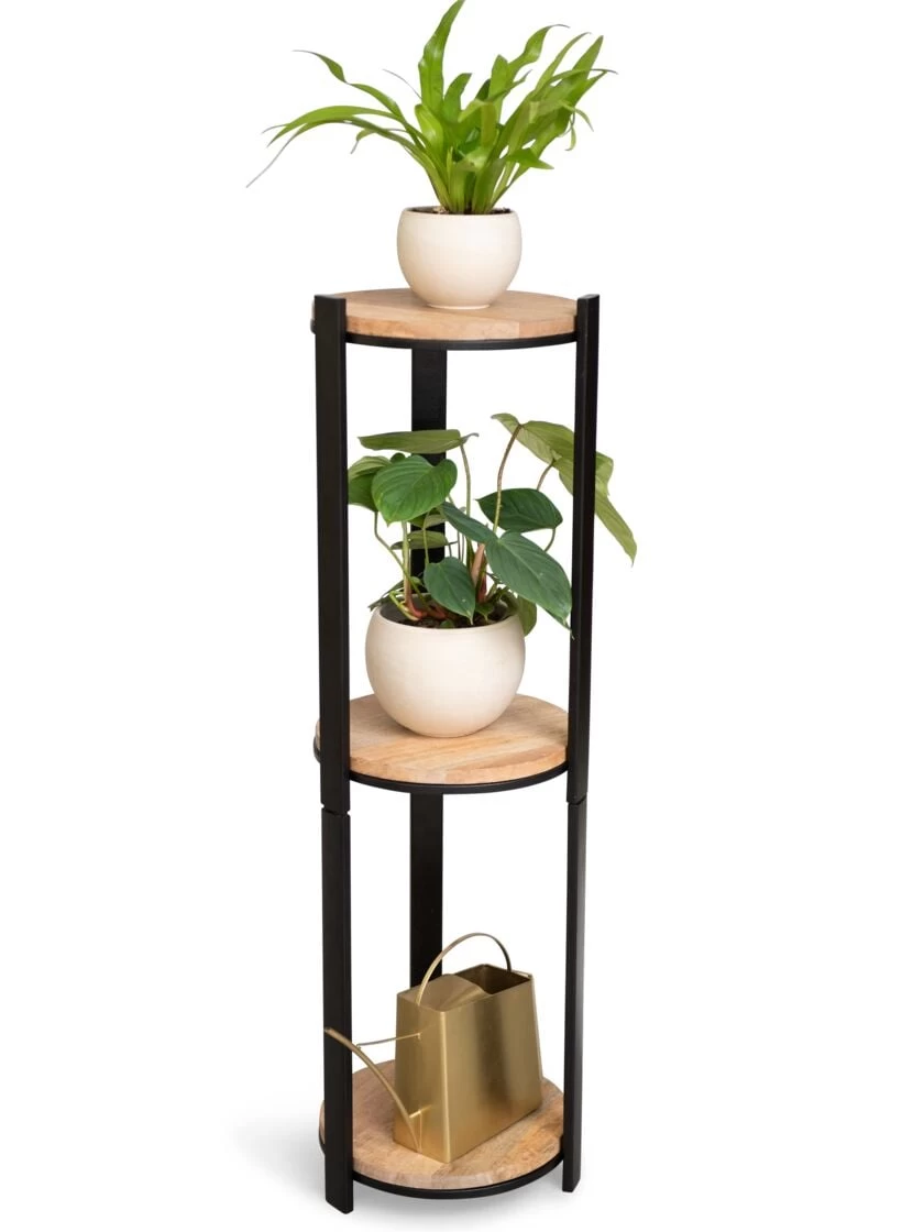 A matte black frame in powder-coated steel and beautifully stained shelves made from discs of sustainable mango wood provide a refined and sturdy stage for your greenery to steal the scenery. A small footprint with plenty of display area makes this a perfect plant display solution for any size space. Fit a handful of smaller pots per level, or put a few larger plants in the spotlight. The durable and versatile materials give you the option to use this tower indoors or outdoors.